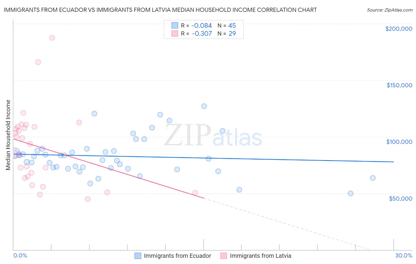 Immigrants from Ecuador vs Immigrants from Latvia Median Household Income Correlation Chart