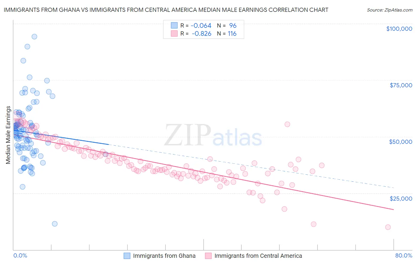 Immigrants from Ghana vs Immigrants from Central America Median Male Earnings Correlation Chart