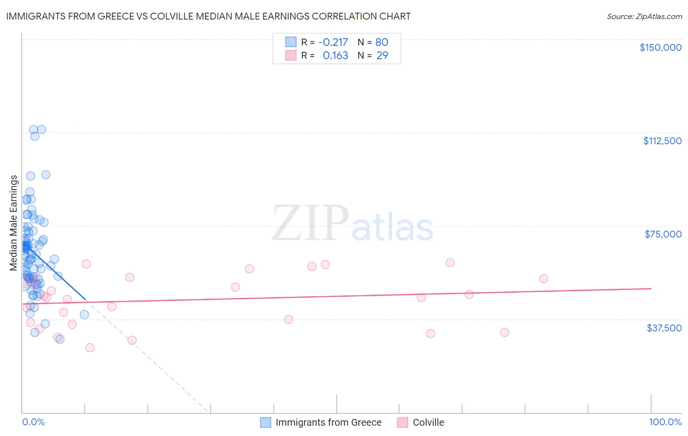 Immigrants from Greece vs Colville Median Male Earnings Correlation Chart
