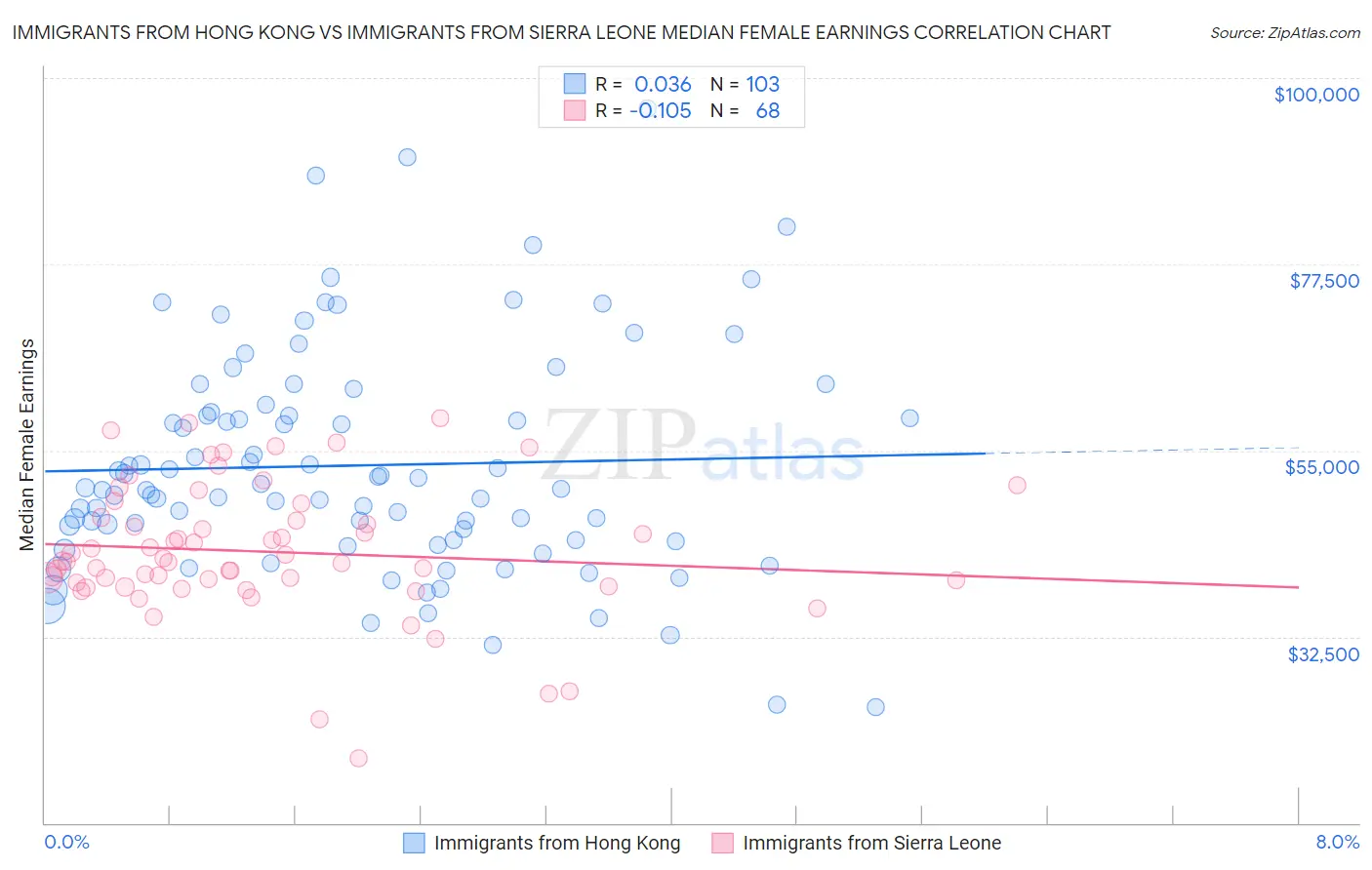 Immigrants from Hong Kong vs Immigrants from Sierra Leone Median Female Earnings Correlation Chart