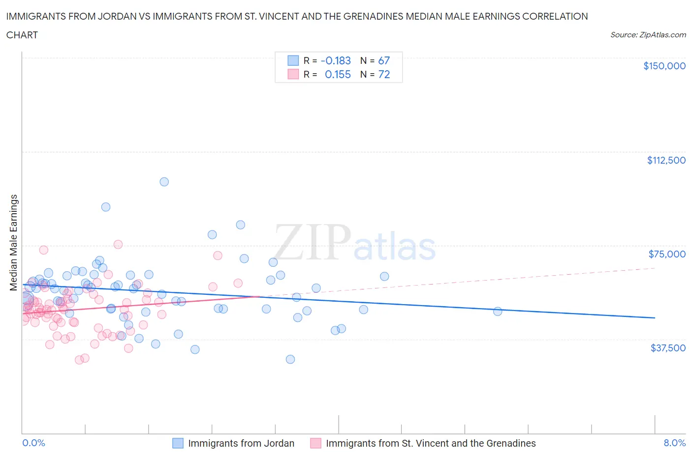 Immigrants from Jordan vs Immigrants from St. Vincent and the Grenadines Median Male Earnings Correlation Chart