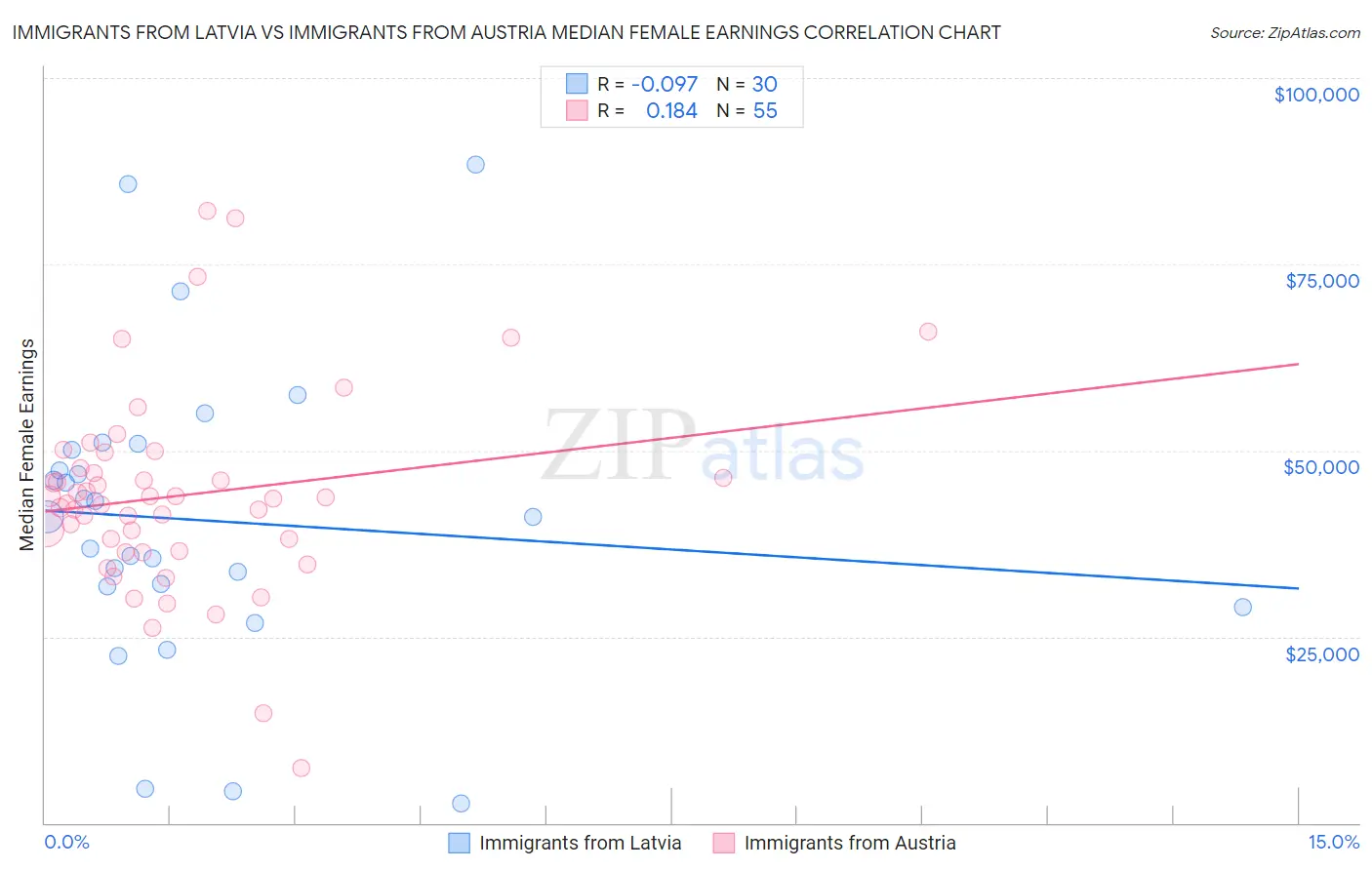 Immigrants from Latvia vs Immigrants from Austria Median Female Earnings Correlation Chart