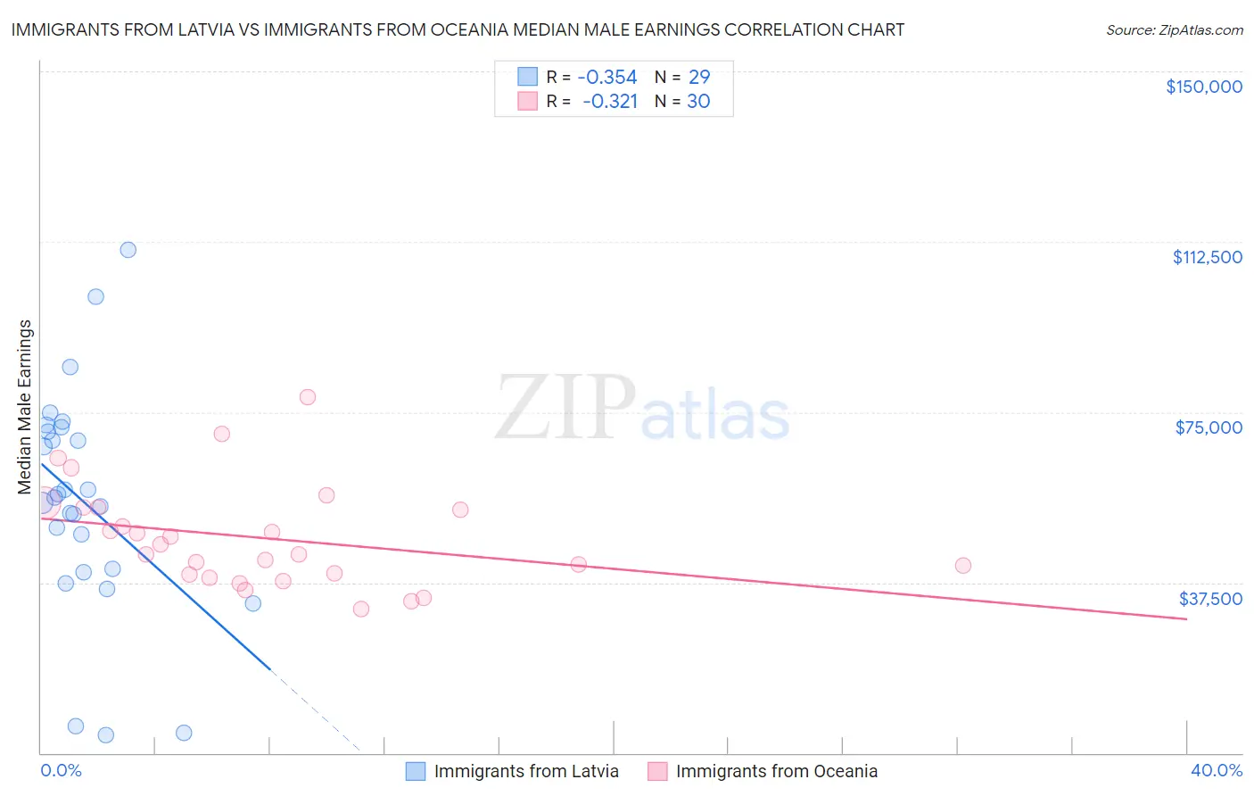 Immigrants from Latvia vs Immigrants from Oceania Median Male Earnings Correlation Chart