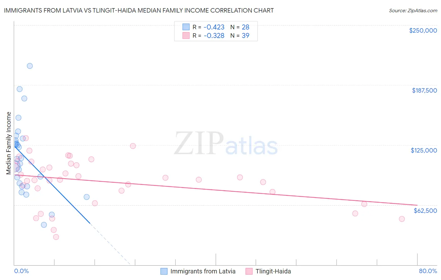 Immigrants from Latvia vs Tlingit-Haida Median Family Income Correlation Chart