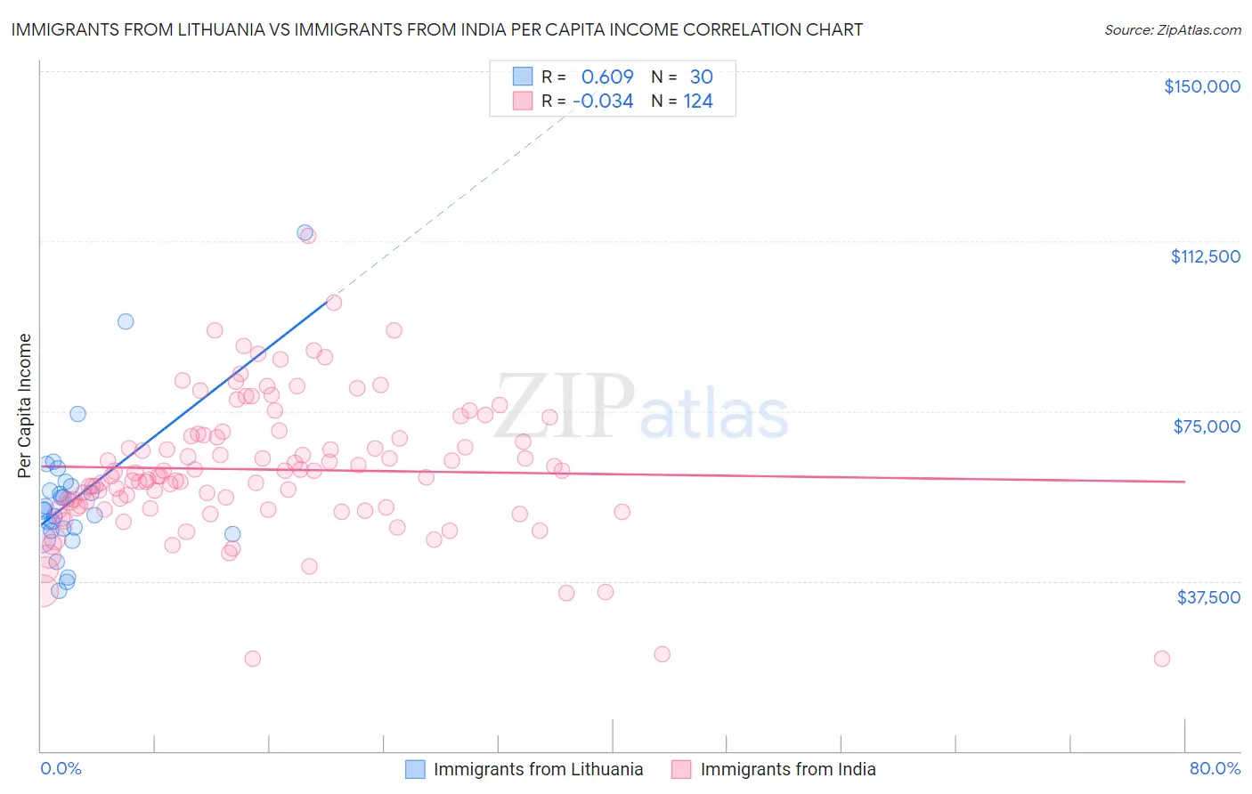 Immigrants from Lithuania vs Immigrants from India Per Capita Income Correlation Chart