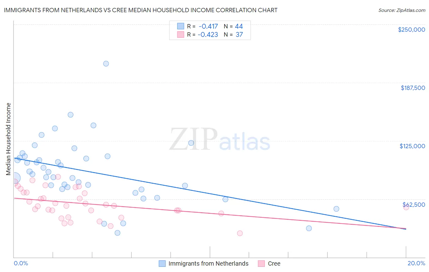 Immigrants from Netherlands vs Cree Median Household Income Correlation Chart