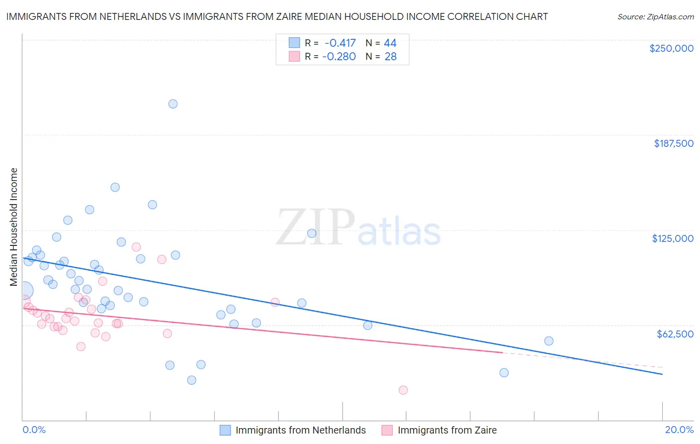 Immigrants from Netherlands vs Immigrants from Zaire Median Household Income Correlation Chart