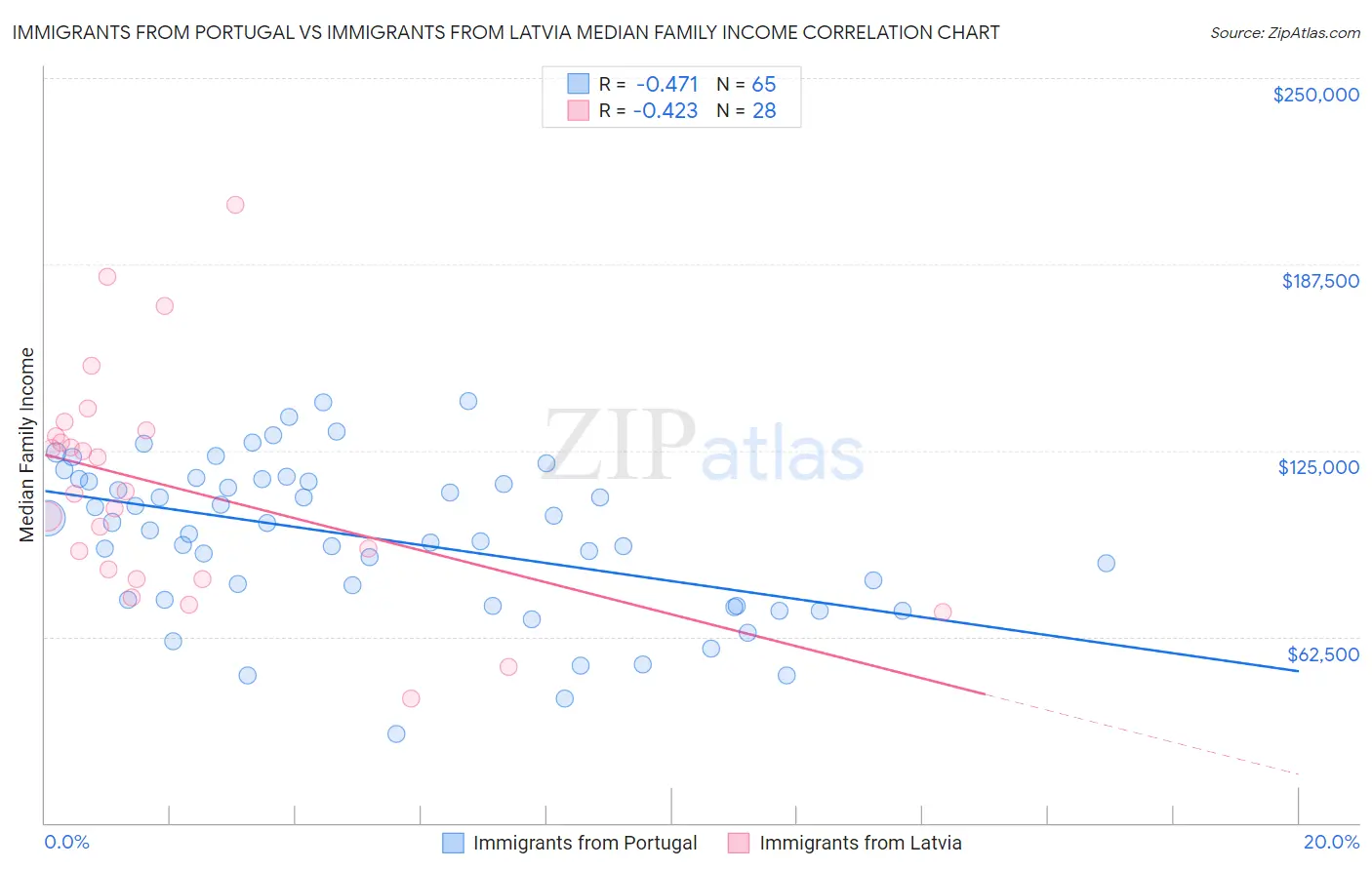 Immigrants from Portugal vs Immigrants from Latvia Median Family Income Correlation Chart