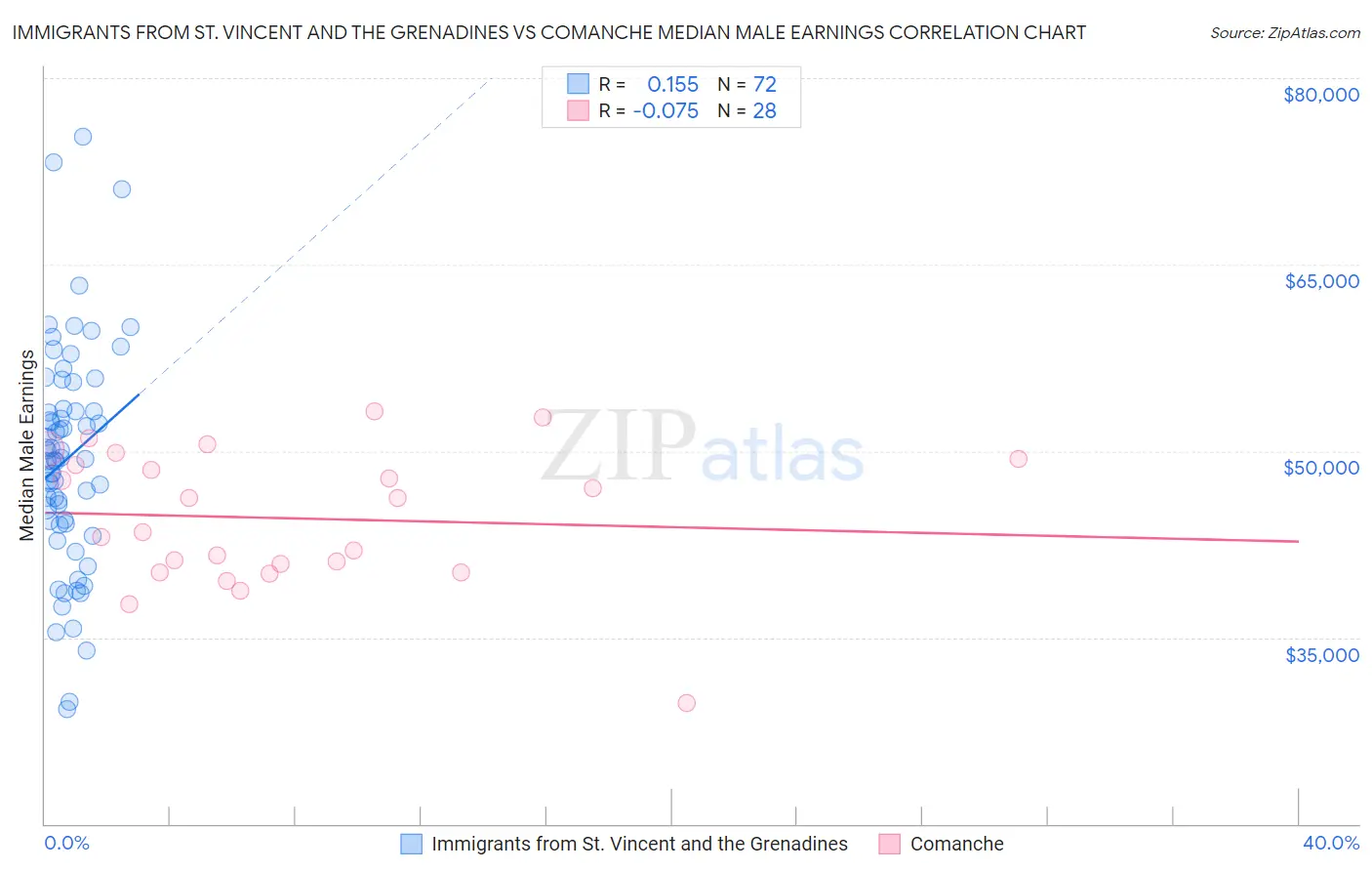 Immigrants from St. Vincent and the Grenadines vs Comanche Median Male Earnings Correlation Chart