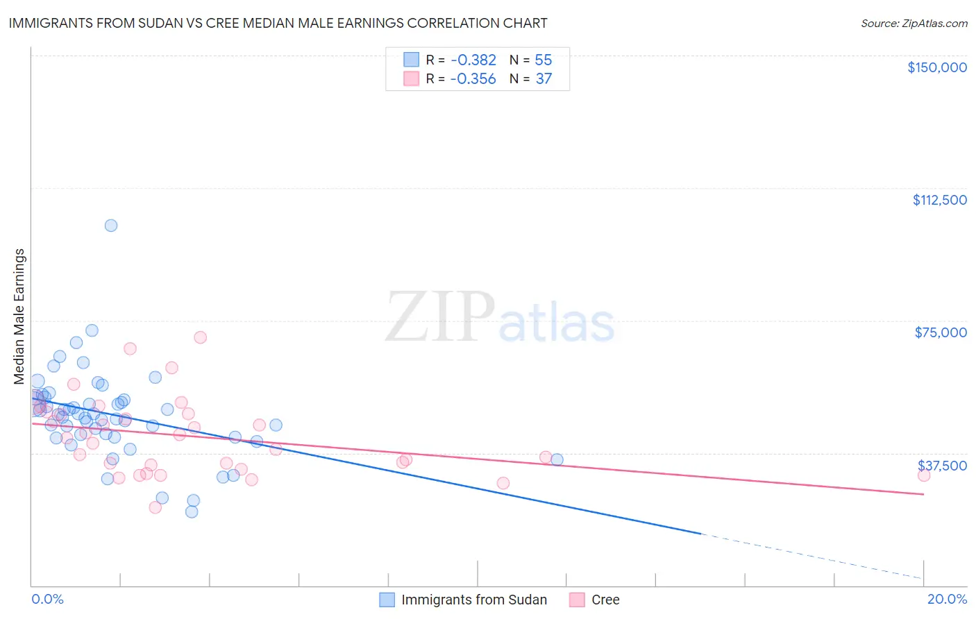 Immigrants from Sudan vs Cree Median Male Earnings Correlation Chart