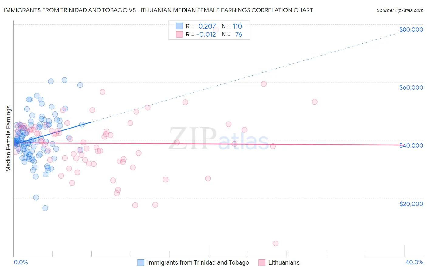 The statistical analysis conducted on geographies consisting of 223,490,788 people shows a weak positive correlation between the proportion of Immigrants from Trinidad and Tobago and median female earnings in the United States with a correlation coefficient (R) of 0.207 and weighted average of $40,895. Similarly, the statistical analysis conducted on geographies consisting of 421,690,318 people shows no correlation between the proportion of Lithuanians and median female earnings in the United States with a correlation coefficient (R) of -0.012 and weighted average of $42,108, a difference of 3.0%.