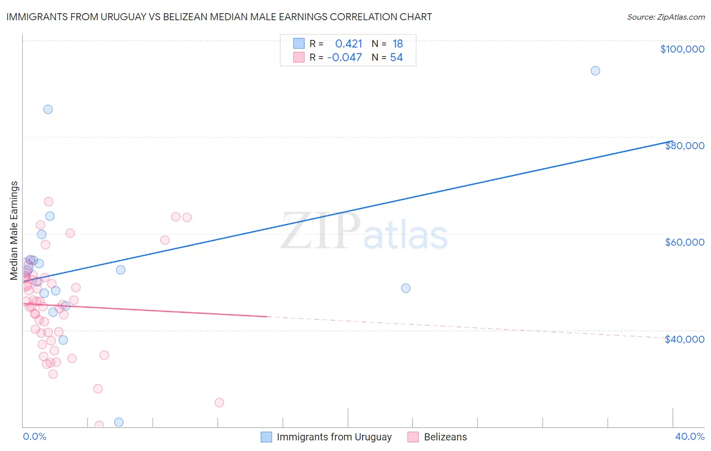 Immigrants from Uruguay vs Belizean Median Male Earnings Correlation Chart