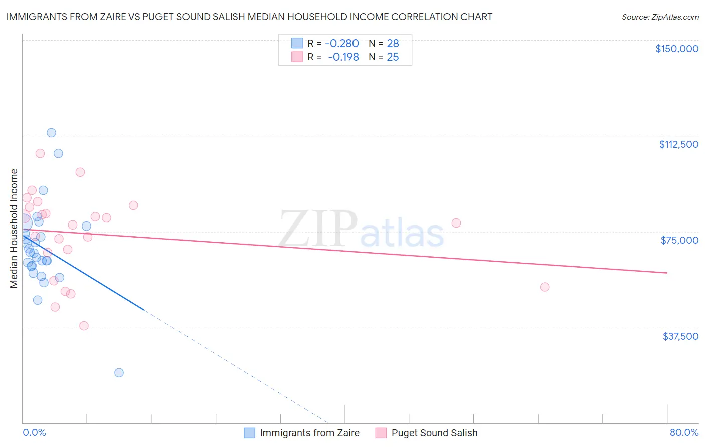 Immigrants from Zaire vs Puget Sound Salish Median Household Income Correlation Chart