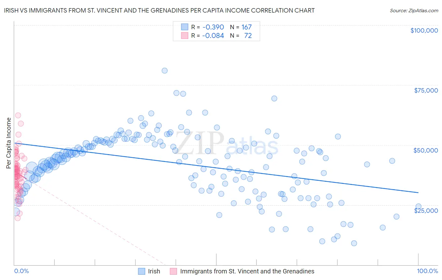 Irish vs Immigrants from St. Vincent and the Grenadines Per Capita Income Correlation Chart