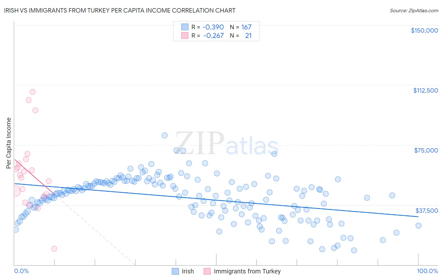 Irish vs Immigrants from Turkey Per Capita Income Correlation Chart