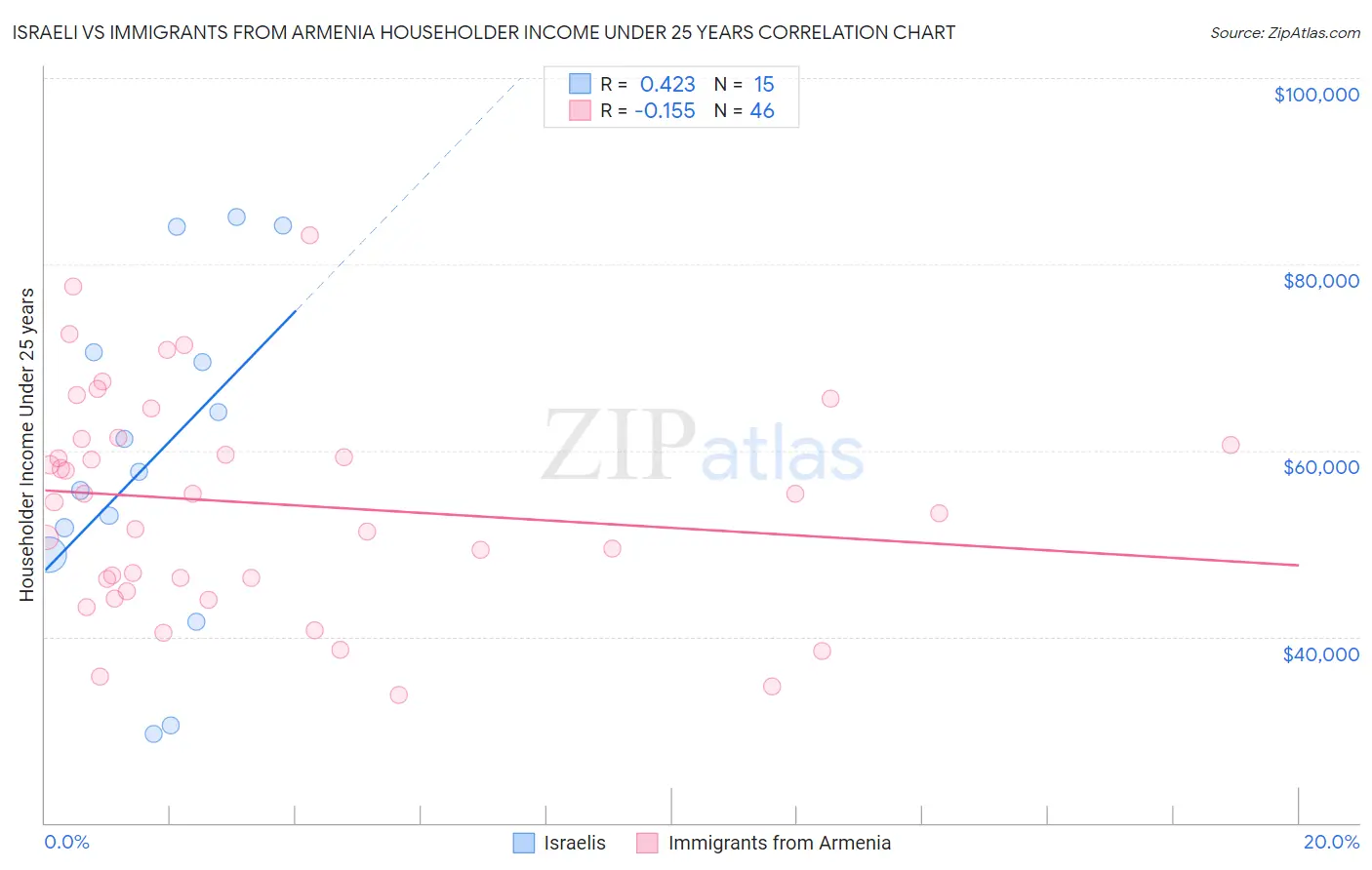 Israeli vs Immigrants from Armenia Householder Income Under 25 years Correlation Chart
