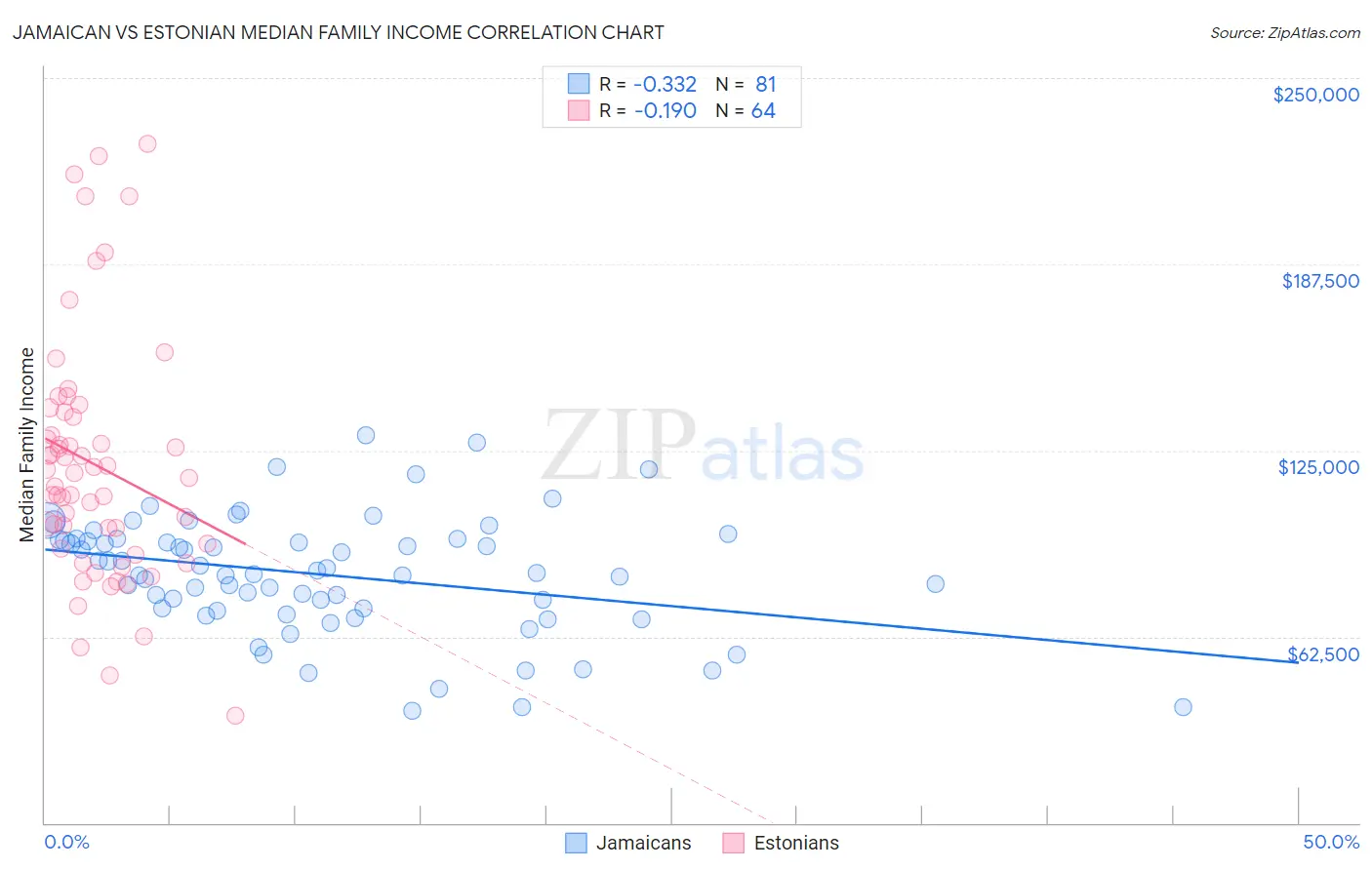 The statistical analysis conducted on geographies consisting of 367,485,053 people shows a mild negative correlation between the proportion of Jamaicans and median family income in the United States with a correlation coefficient (R) of -0.332 and weighted average of $90,581. Similarly, the statistical analysis conducted on geographies consisting of 123,476,939 people shows a poor negative correlation between the proportion of Estonians and median family income in the United States with a correlation coefficient (R) of -0.190 and weighted average of $118,013, a difference of 30.3%.
