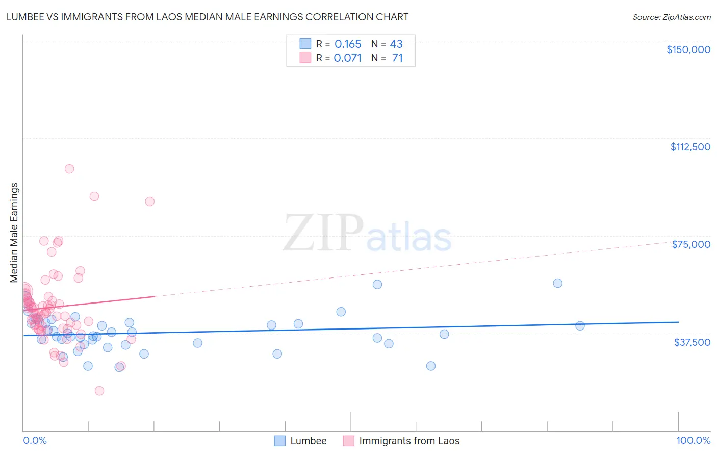 Lumbee vs Immigrants from Laos Median Male Earnings Correlation Chart
