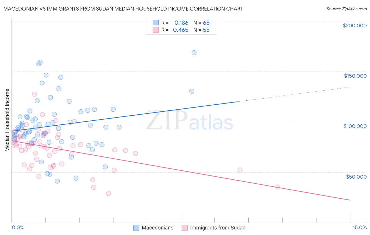Macedonian vs Immigrants from Sudan Median Household Income Correlation Chart