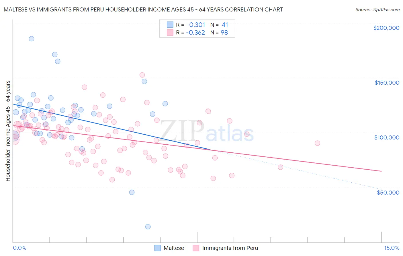 Maltese vs Immigrants from Peru Householder Income Ages 45 - 64 years Correlation Chart