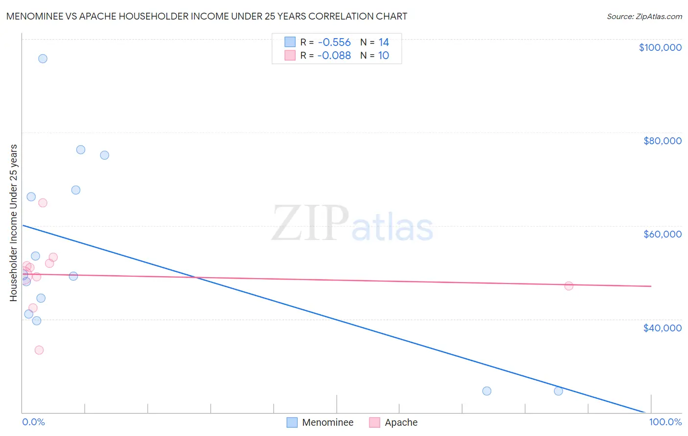 Menominee vs Apache Householder Income Under 25 years Correlation Chart