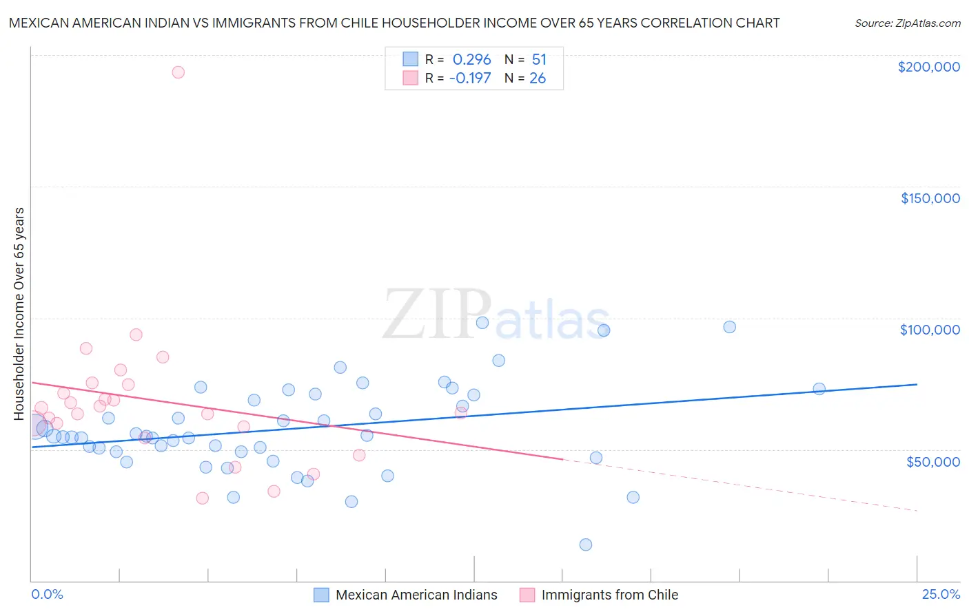 Mexican American Indian vs Immigrants from Chile Householder Income Over 65 years Correlation Chart