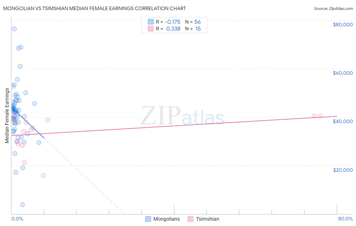 Mongolian vs Tsimshian Median Female Earnings Correlation Chart
