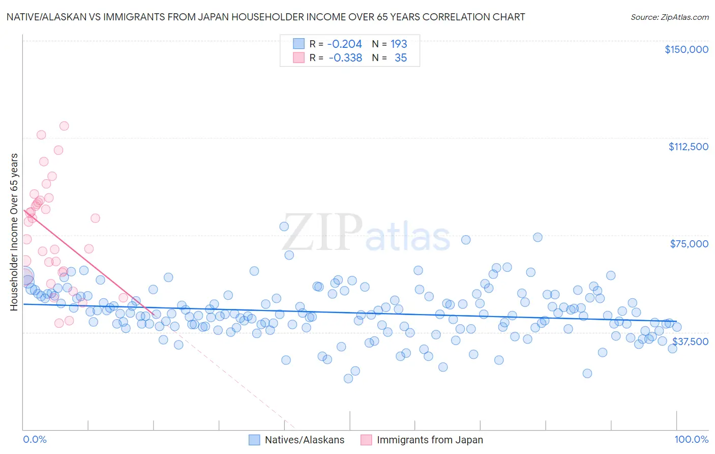 Native/Alaskan vs Immigrants from Japan Householder Income Over 65 years Correlation Chart