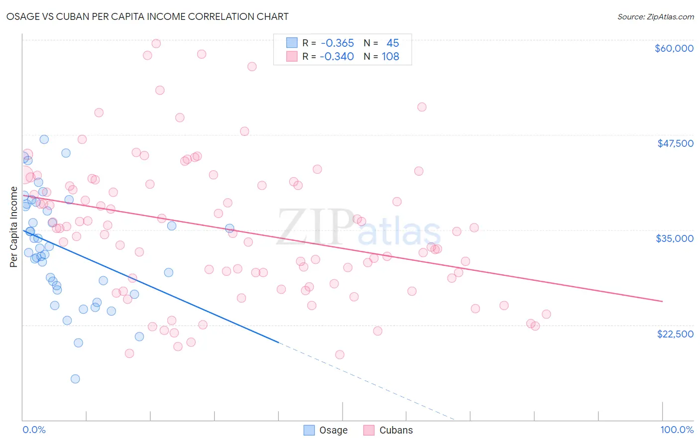 The statistical analysis conducted on geographies consisting of 91,808,929 people shows a mild negative correlation between the proportion of Osage and per capita income in the United States with a correlation coefficient (R) of -0.365 and weighted average of $39,568. Similarly, the statistical analysis conducted on geographies consisting of 449,330,794 people shows a mild negative correlation between the proportion of Cubans and per capita income in the United States with a correlation coefficient (R) of -0.340 and weighted average of $37,383, a difference of 5.9%.