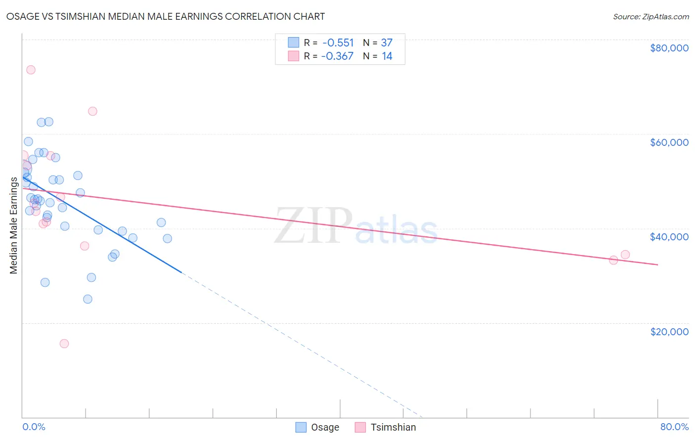 Osage vs Tsimshian Median Male Earnings Correlation Chart