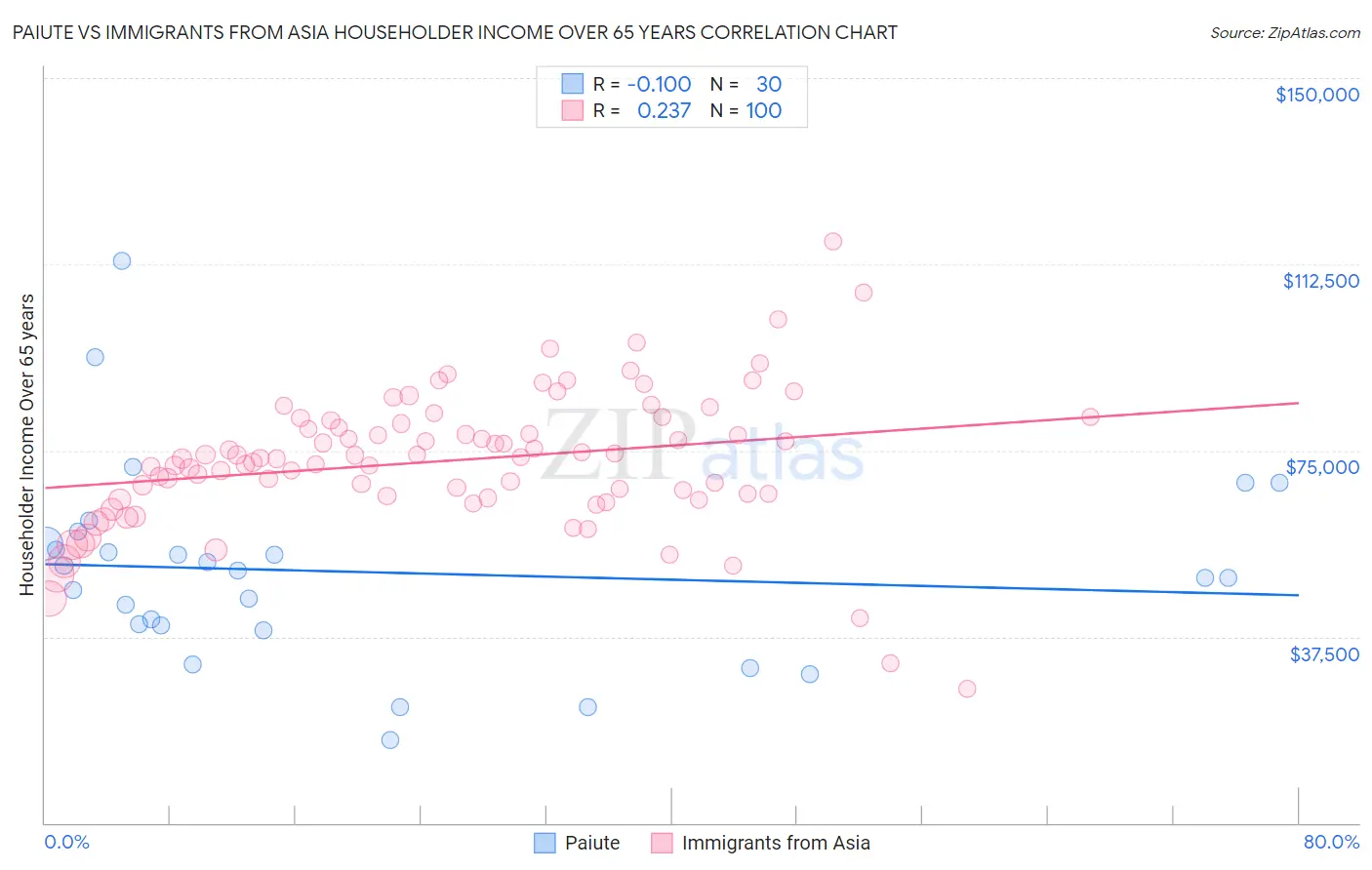 Paiute vs Immigrants from Asia Householder Income Over 65 years Correlation Chart