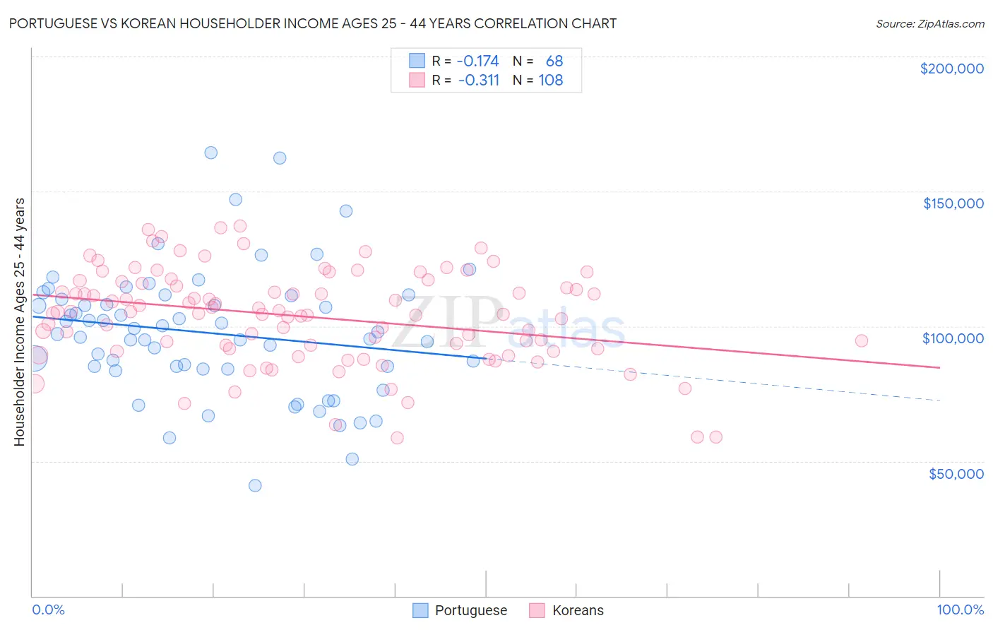 Portuguese vs Korean Householder Income Ages 25 - 44 years Correlation Chart