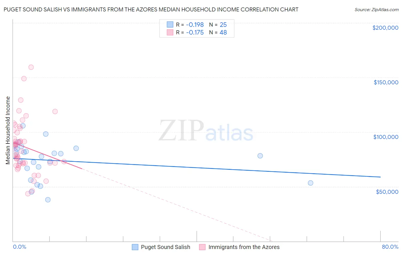 Puget Sound Salish vs Immigrants from the Azores Median Household Income Correlation Chart
