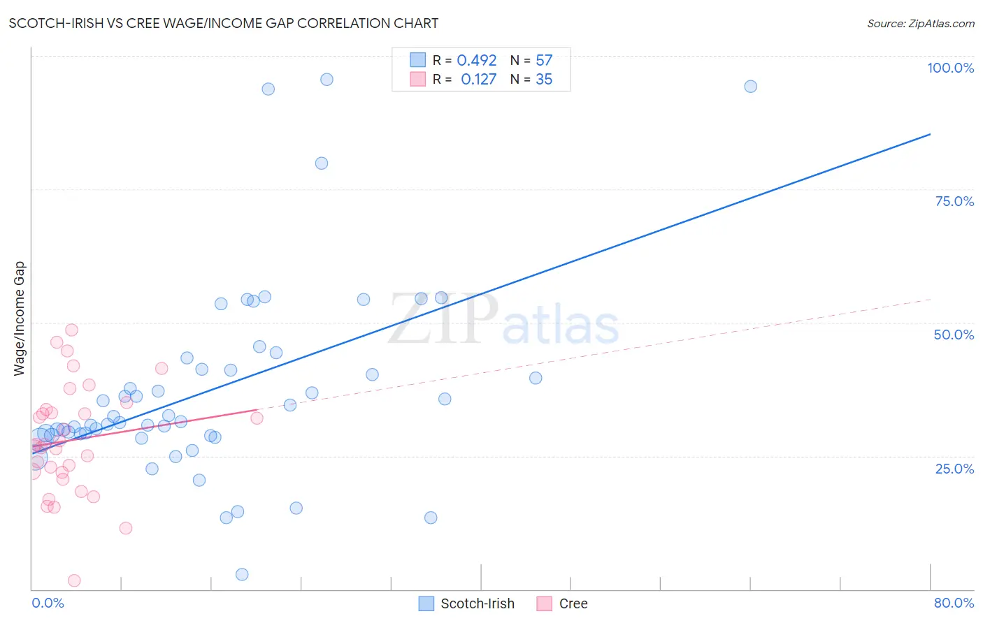 Scotch-Irish vs Cree Wage/Income Gap Correlation Chart