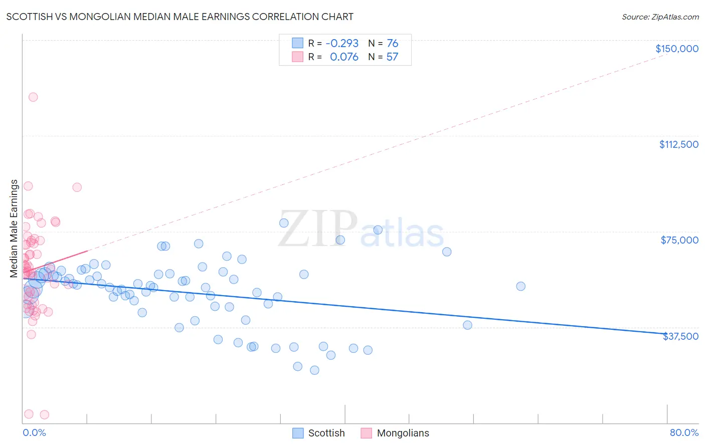 The statistical analysis conducted on geographies consisting of 565,821,197 people shows a weak negative correlation between the proportion of Scottish and median male earnings in the United States with a correlation coefficient (R) of -0.293 and weighted average of $55,793. Similarly, the statistical analysis conducted on geographies consisting of 140,336,104 people shows a slight positive correlation between the proportion of Mongolians and median male earnings in the United States with a correlation coefficient (R) of 0.076 and weighted average of $60,350, a difference of 8.2%.