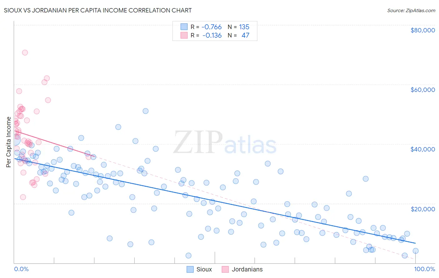 Sioux vs Jordanian Per Capita Income Correlation Chart