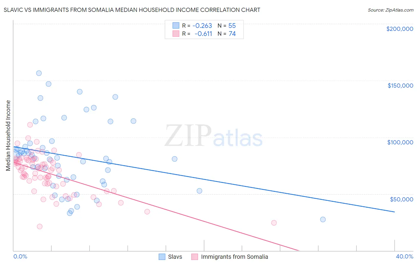 Slavic vs Immigrants from Somalia Median Household Income Correlation Chart