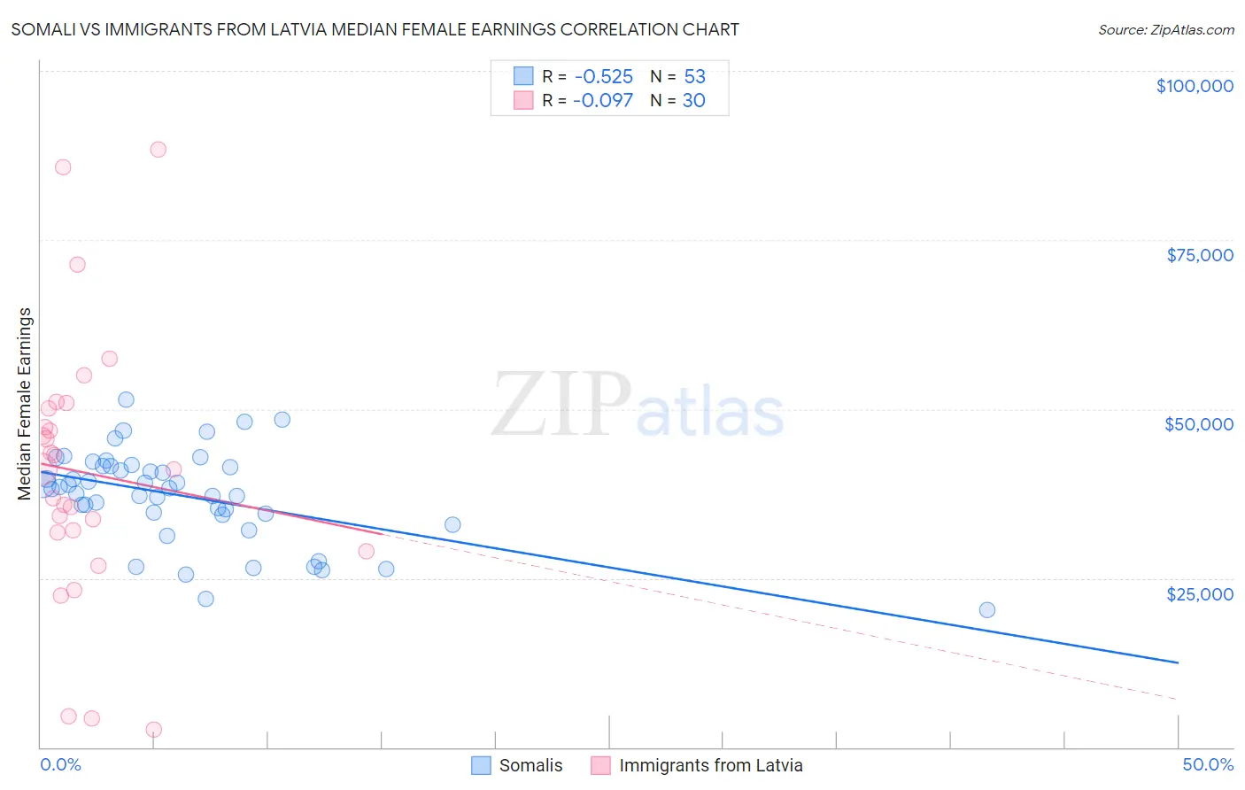 Somali vs Immigrants from Latvia Median Female Earnings Correlation Chart