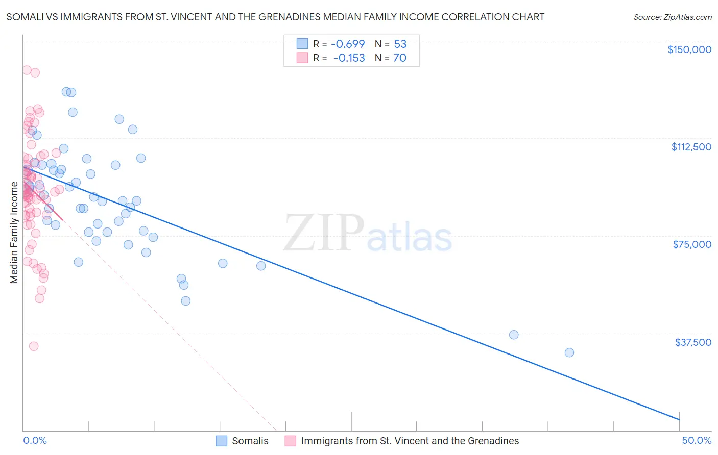 Somali vs Immigrants from St. Vincent and the Grenadines Median Family Income Correlation Chart