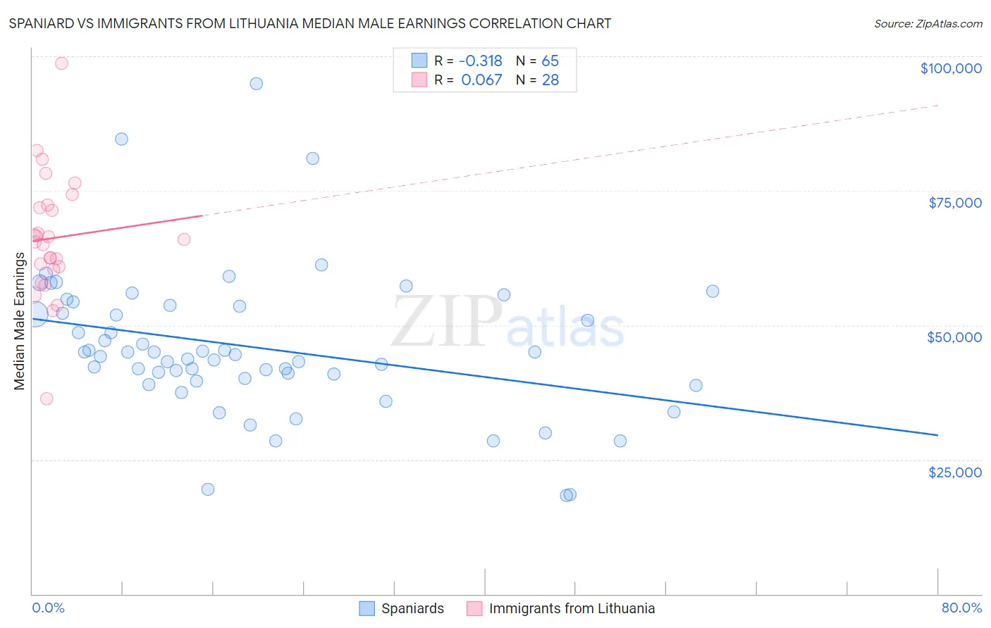 Spaniard vs Immigrants from Lithuania Median Male Earnings Correlation Chart