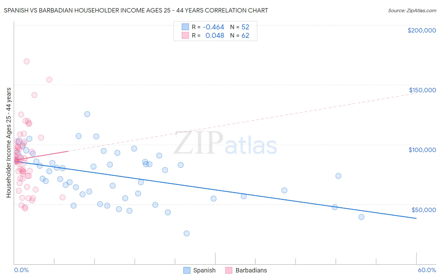Spanish vs Barbadian Householder Income Ages 25 - 44 years Correlation Chart