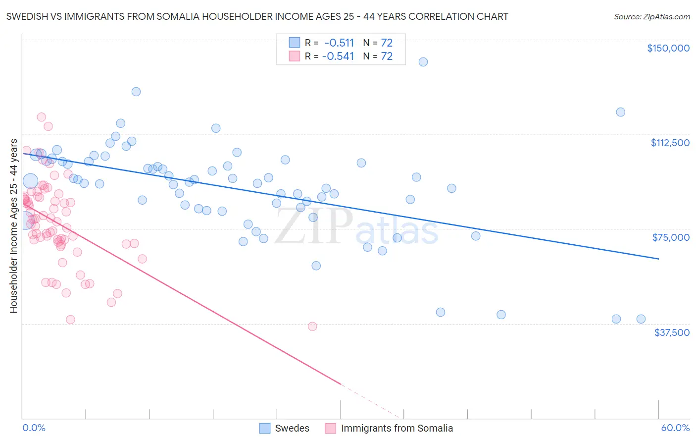Swedish vs Immigrants from Somalia Householder Income Ages 25 - 44 years Correlation Chart
