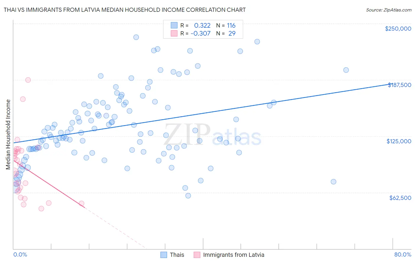 Thai vs Immigrants from Latvia Median Household Income Correlation Chart