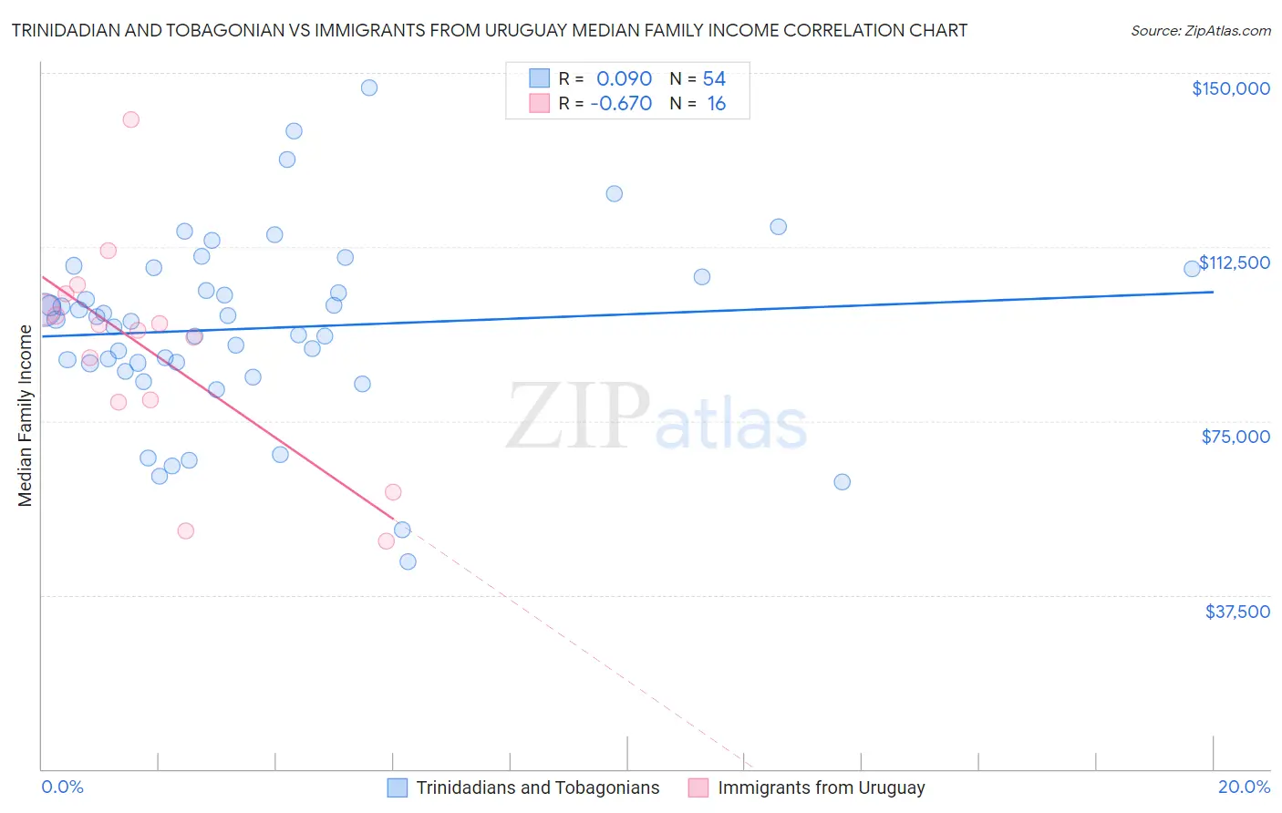 Trinidadian and Tobagonian vs Immigrants from Uruguay Median Family Income Correlation Chart