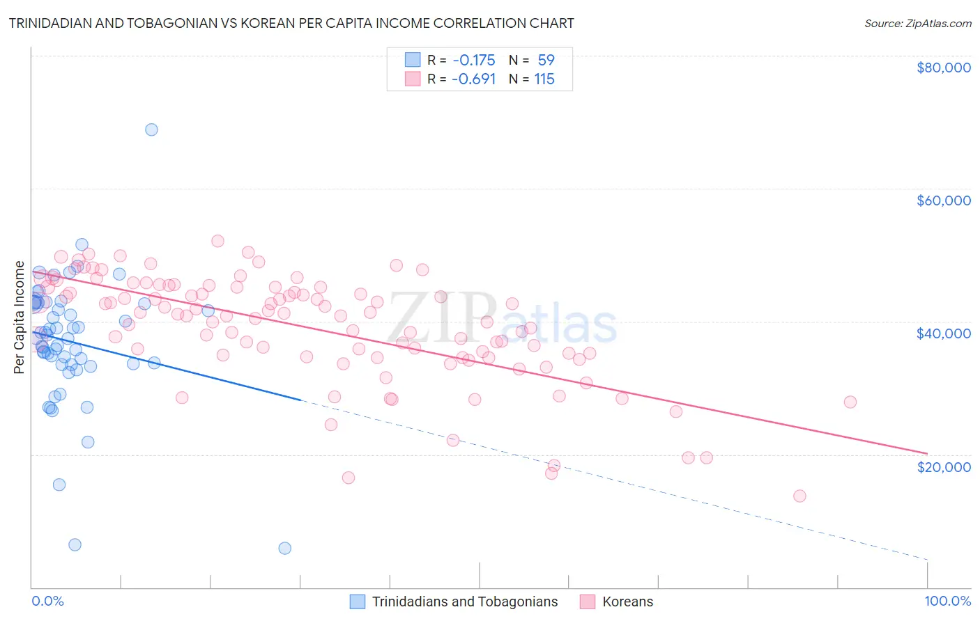 Trinidadian and Tobagonian vs Korean Per Capita Income Correlation Chart