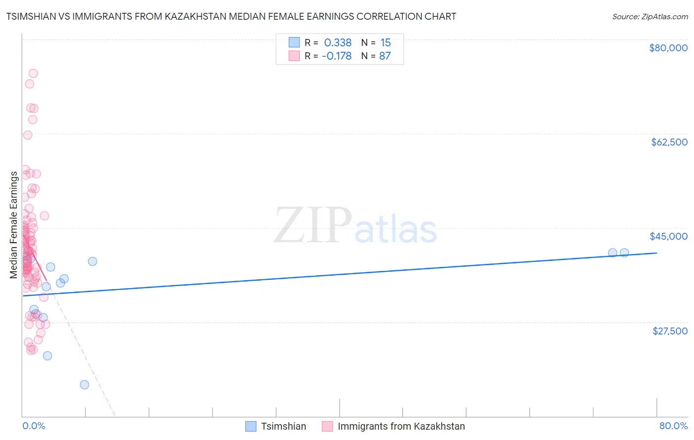 Tsimshian vs Immigrants from Kazakhstan Median Female Earnings Correlation Chart