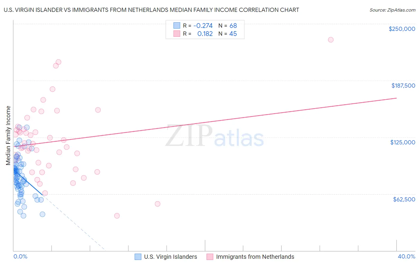 U.S. Virgin Islander vs Immigrants from Netherlands Median Family Income Correlation Chart