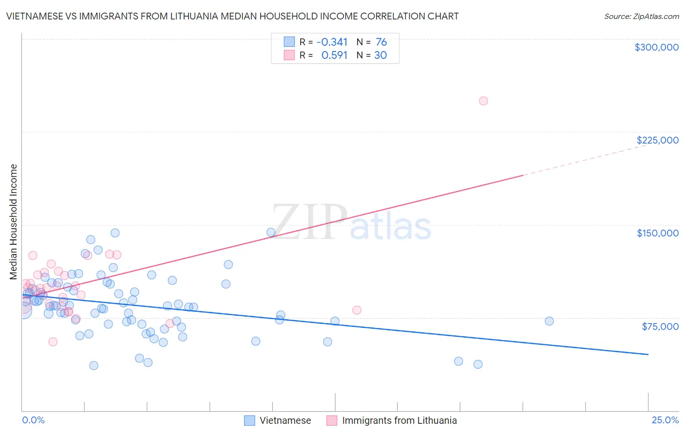 Vietnamese vs Immigrants from Lithuania Median Household Income Correlation Chart
