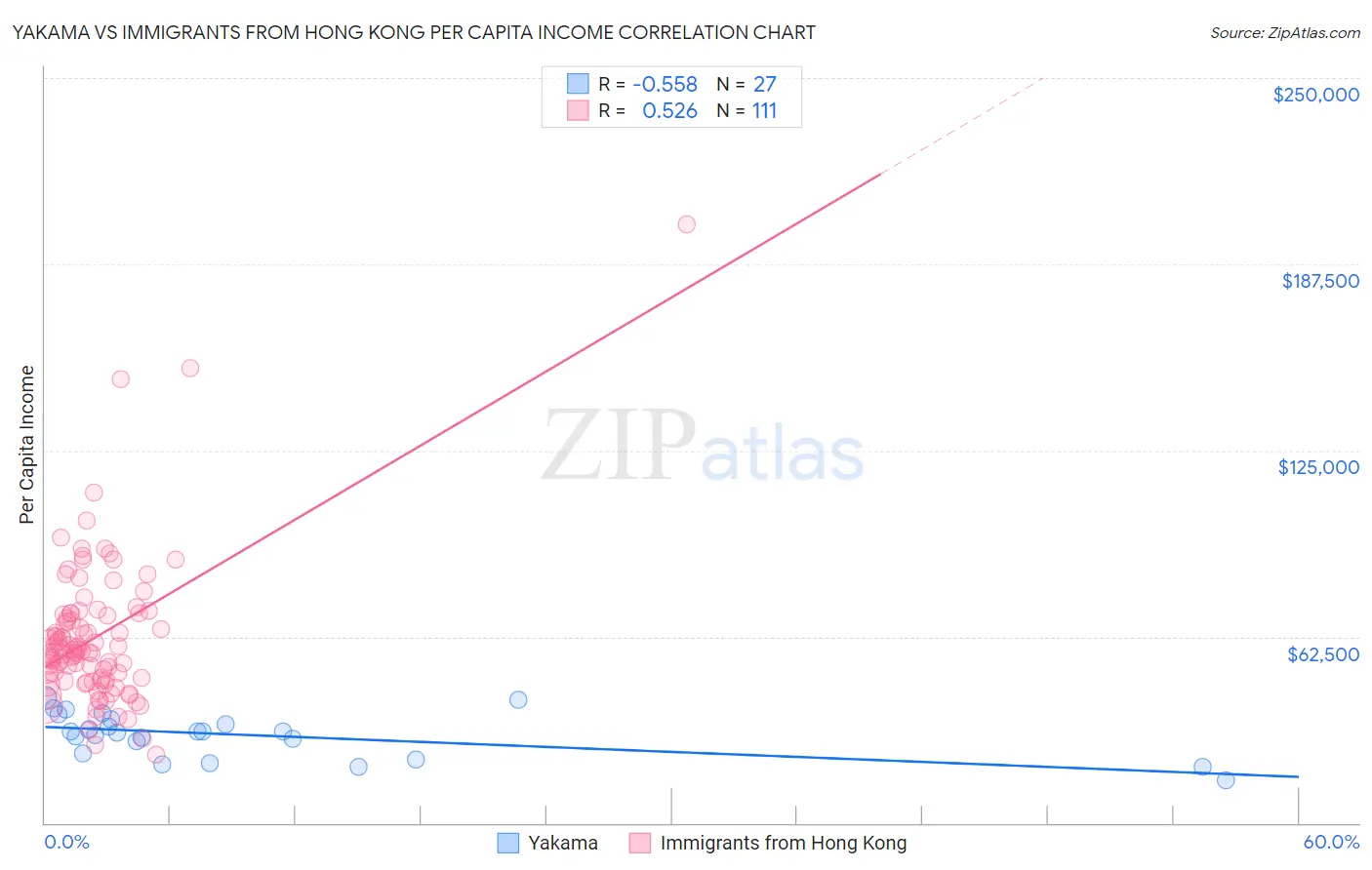 Yakama vs Immigrants from Hong Kong Per Capita Income Correlation Chart