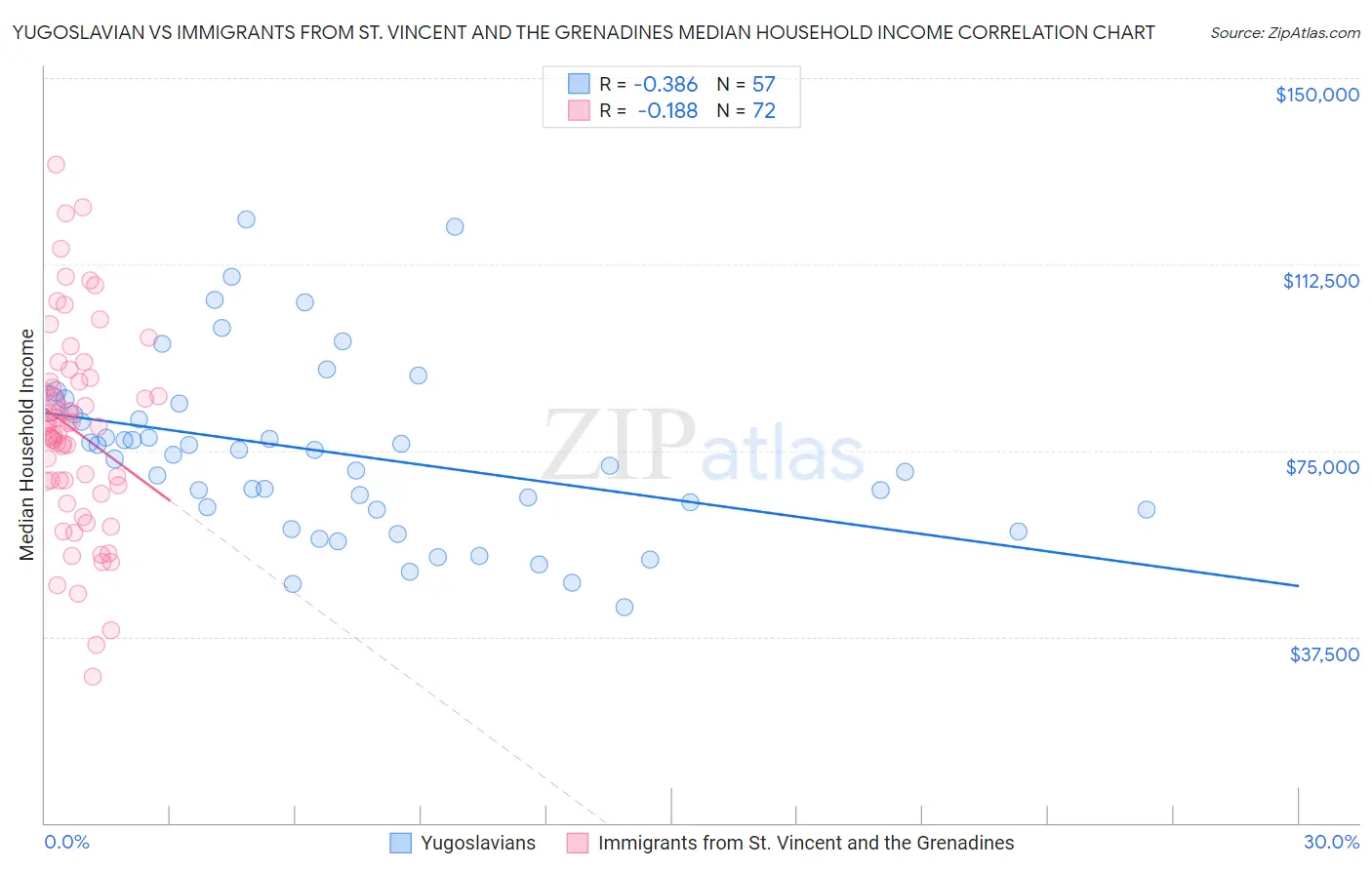 Yugoslavian vs Immigrants from St. Vincent and the Grenadines Median Household Income Correlation Chart